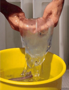 Hans lays the Hagfish down on the cart and turns on the electrode device, running a probe along the creatures length. Instantly a line of milky mucus oozes form its sides. Hans picks the Hagfish up and drops it into a yellow pail of water. After about 30 seconds, Hans reaches into he bucket and lifts a large clot of slimy jellified water.